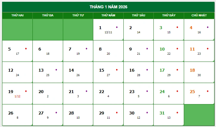 Điều này đặc biệt hữu ích cho việc sắp xếp lịch làm việc, du lịch hoặc các sự kiện gia đình. Giao diện dạng bảng lưới giúp bạn cuộn xem nhanh chóng, với màu sắc phân biệt ngày tốt (xanh) và ngày xấu (đỏ).